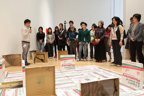 沖縄出身でニューヨーク在住の照屋さんは、2004年に沖縄で起きた米軍ヘリ墜落事件を受け、《来るべき世界に》というピザボックスの作品を制作しました。なぜピザの箱なのか――、「六本木クロッシング2010展」の会場で作品を前にお話しいただきました。