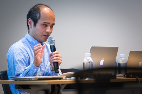 小澤慶介さん司会の今回 は、東京における「内なるアジア」に着目する高山明さんの紹介から始まりました。新作《バベル》では、2020年のオリンピックの建築現場に立つ外国人労働者の姿と、1964年のオリンピックの建築現場で働いた日本人男性がモニターに映し出されます。表舞台に現れない人々に焦点を当てながら、高山さんはふたつの巨大な国家プロジェクトを時代を超えて結びつけるのです。