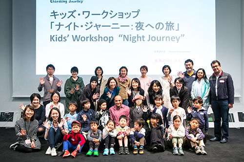 2017年4月22日、23日の開催当日。参加者のなかには東京以外の遠くの県から参加してくれた親子もいました。ワークショップのメインアクティビティは、あこがれのヒーローに変身して夜の街にくりだし、真黒な画用紙に光を手掛かりに夜の街を描くこと。1日目は、インド、マイスールからこのワークショップのために再来日したハルシャの挨拶からはじまり、夜を描くときのポイントとして「光の反射」「光のまたたき」についてハルシャ自らが実例を示しながら説明しました。参加者たちはそのポイントをたよりに、夜の風景を見る疑似体験を行いました。後半は、ハルシャと一緒に展覧会を鑑賞。2000人以上の人たちが描かれた作品《ここに演説をしに来て》やハルシャが子どもの頃に描いたドローイング、193台の足踏みミシンが使われた《ネイションズ(国家)》など、子どもたちは展示されている作品に興味津々。みんなでハルシャの作品世界を旅しました。明日の夜はいよいよ六本木の街に飛び出します。